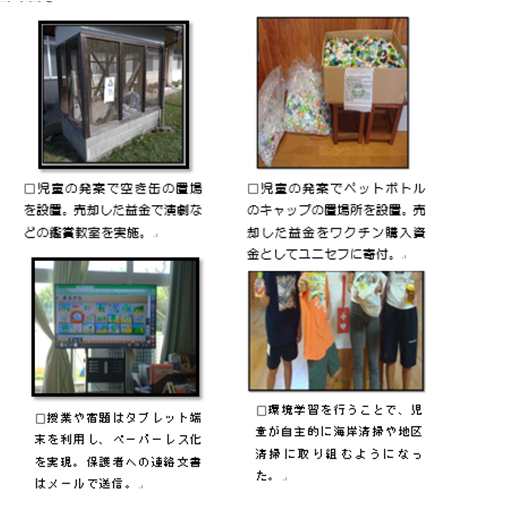 ごみの分別の大切さを学ぶ環境を作ったことにより、児童自らアルミ缶やペットボトルキャップの保管場所を校内に設置し、家庭から持ち寄るようになりました。集まった資源をリサイクル業者に引き渡し、益金を使って、劇などの鑑賞教室の実施や、ワクチン購入資金としてユニセフへの寄付を行っています。